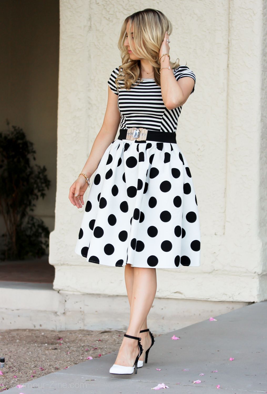 Unless you are attending Dapper Day at Disneyland, a Minnie Mouse inspired look is questionable for an adult woman to be wearing on the street. If you like your dots big, then keep them classy. A voluminous white circle skirt with grand black polka dots is liable to remind people of the aforementioned mouse at best, or the puppy-slaughtering Cruella de Vil at worst. Either way, you are neither a giant mouse nor an insane Glenn Close, so keep big dots to a controlled minimum.